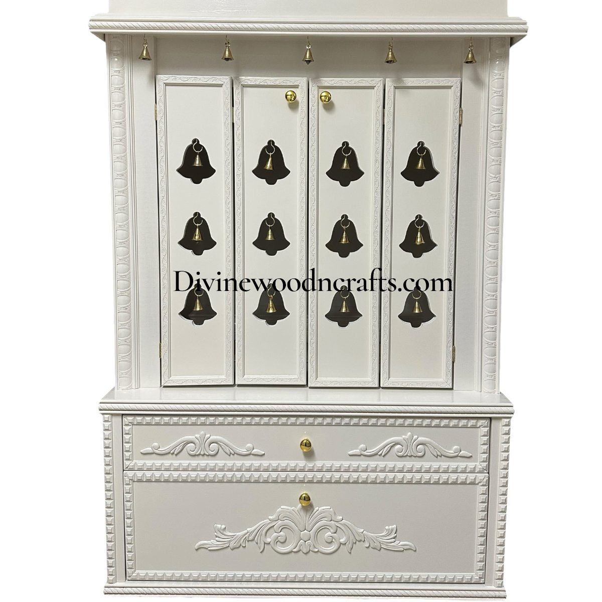 - All temples comes with hand carved bell carvings on the temple along with Commercial quality hardware such as metal drawer gliders, antique knobs and decorative trims.