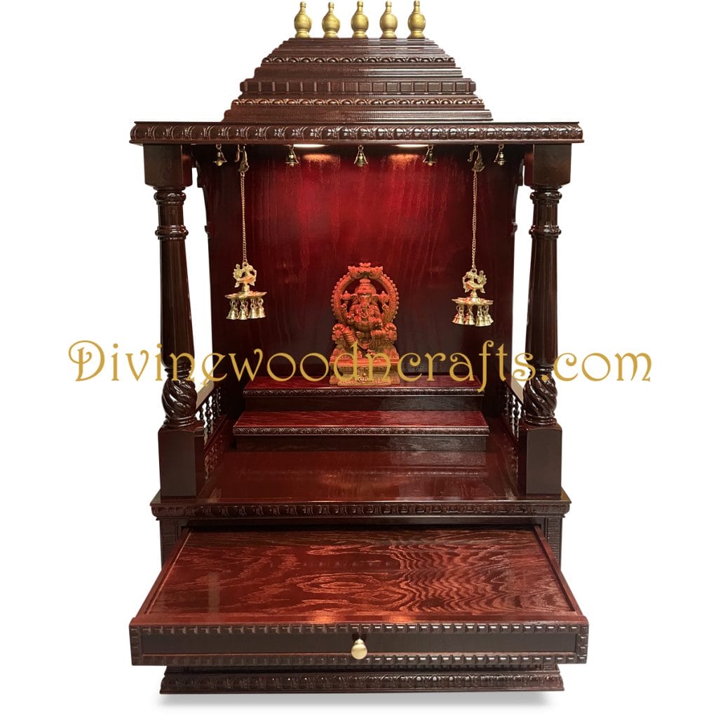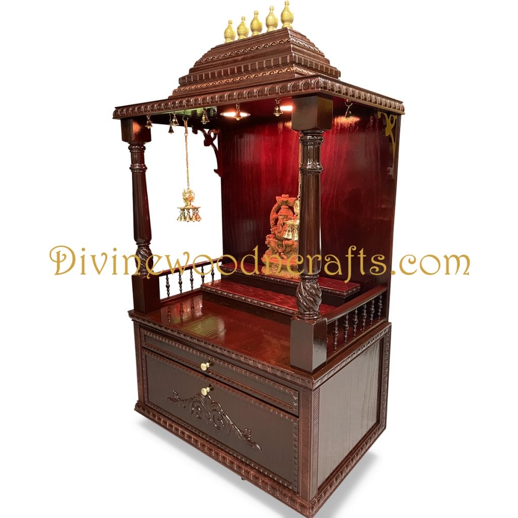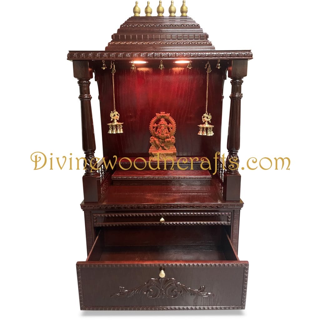 Artistic Traditional Pooja Mandir designs, with Ornamental temple-style carvings, and structures such as Traditional Roof, Kalash and Bells makes the Wooden Temple Design a Beautiful Masterpiece. It also comes with drawers for storage, and can be moved around the house as the occasion demands. The below specifications will be included in the Base Price of the Temple.