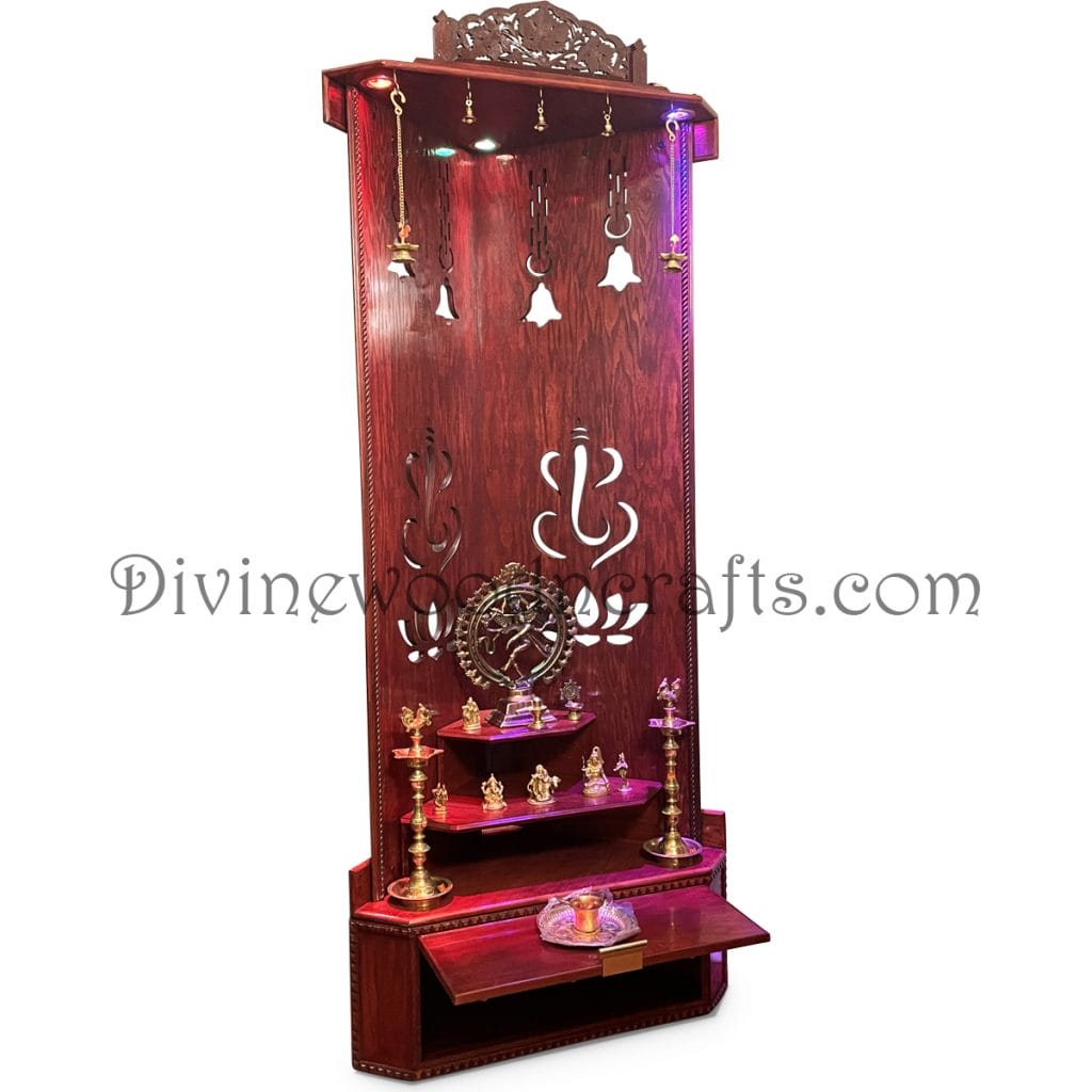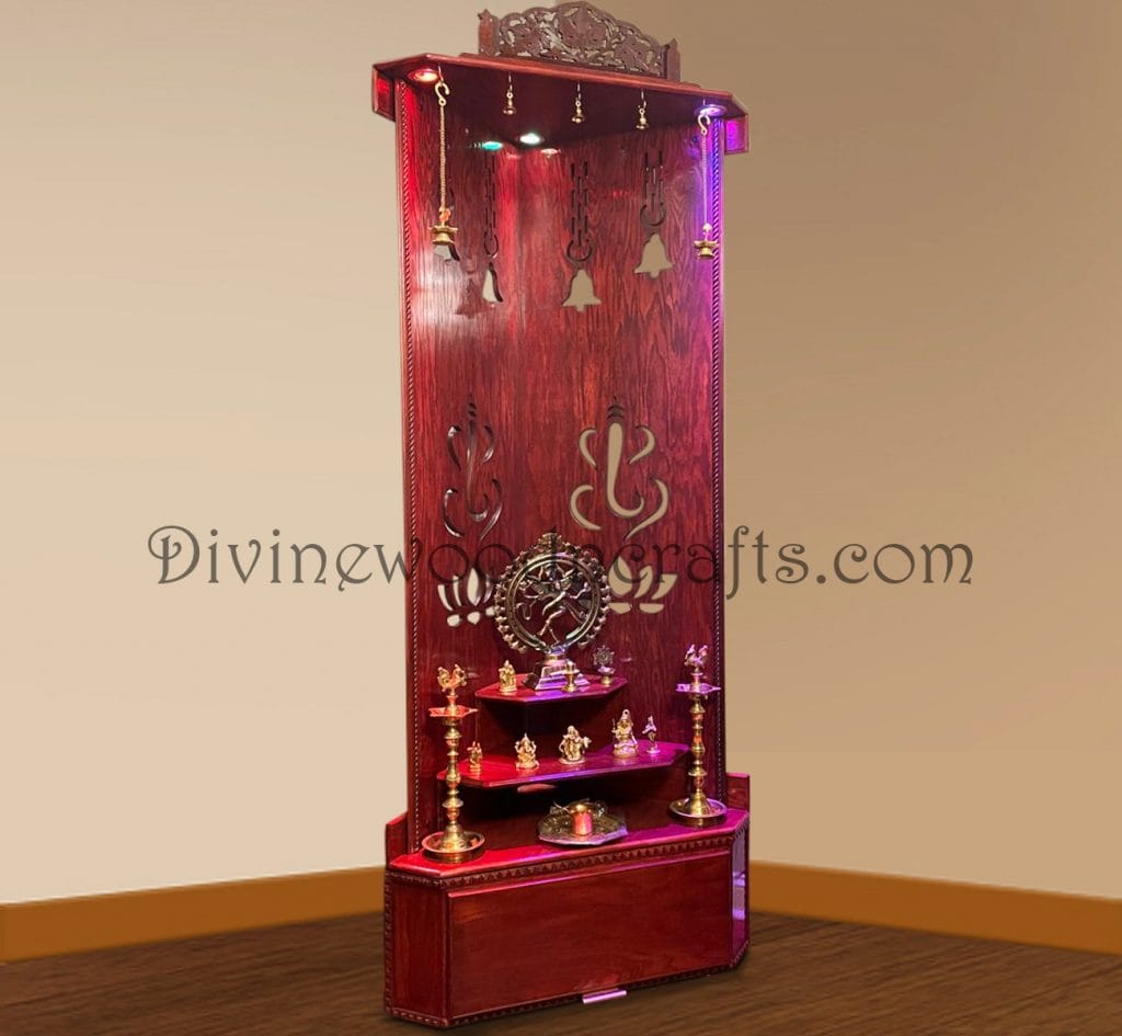 The DivineWoodNCrafts manufacturer of designer wooden Mandirs for home brings to you classical wooden Mandir in a Contemporary finish and style. Get an elegant wooden Pooja Mandir or Prayer unit to make your Home breathtaking with this Contemporary style Pooja Mandirs. This unique V-shaped Corner Mandir will suit Clients who are looking for a Mandir that doesn’t take much space as well as look stylish in the corner of the wall. It also comes with storage and can be moved around the house as the occasion demands. The below specifications will be included in the Base Price of the Temple.